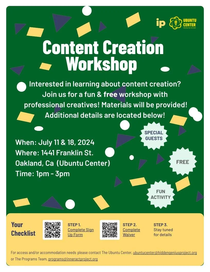 For questions and/or access needs please contact The Programs Team, programs@inneractproject.org or The Ubuntu Center, ubuntucenter@hiddengeniusproject.org